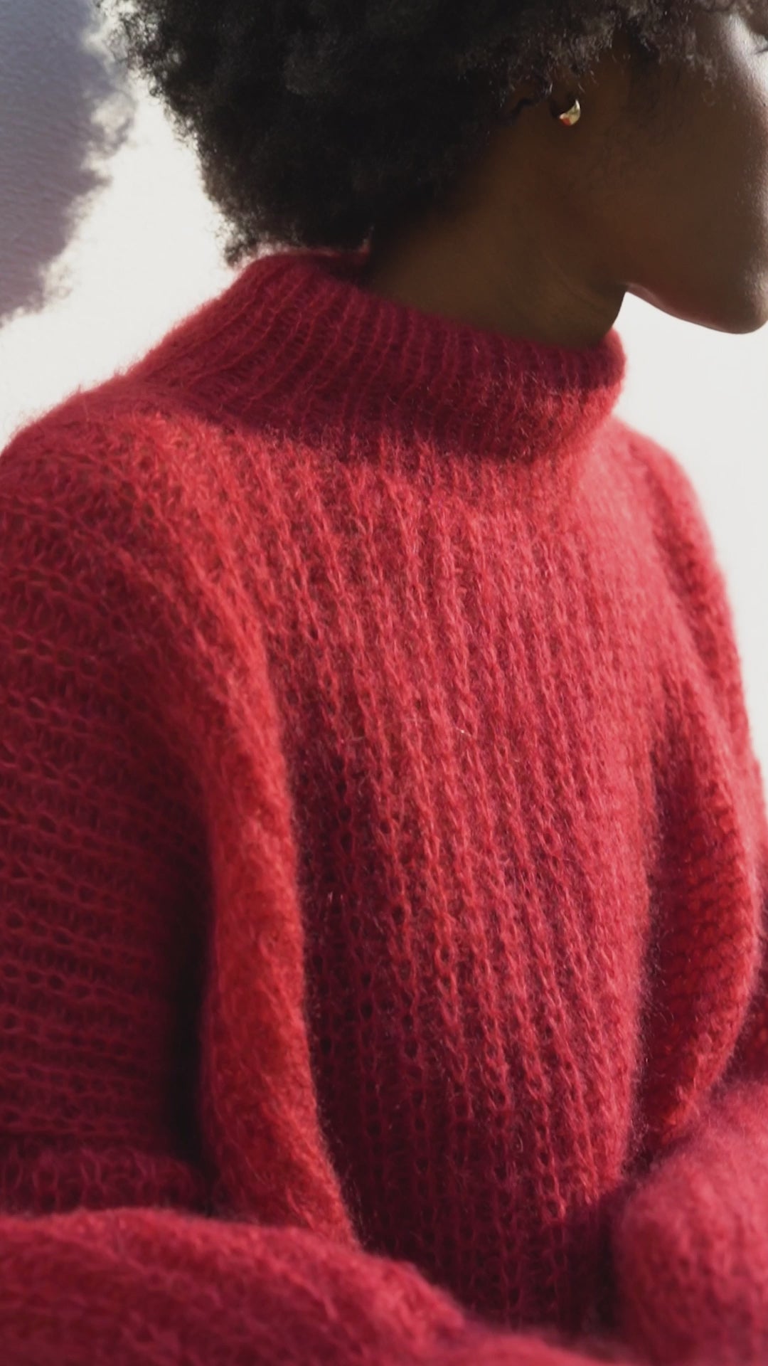 Hochwertiger und elegant-lässiger Oversize Pullover mit geripptem doppelten Stehkragen und typischen VUUNA Ballonärmeln. Der luxuriöse Mix aus edler und softer Mohair-Seide Wolle sorgt für einen kuscheligen Tragekomfort. Ganz besonderen Wert haben alle VUUNA Stücke: Sie sind liebevoll mit der Hand von Frauen in Serbien gestrickt. Den Sweater kannst du vielfaltig kombinieren: als casual Variante mit Jeans oder Hose oder elegant mit einem Rock oder Kleid.