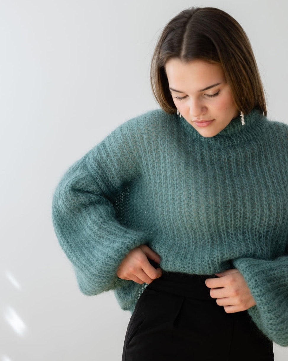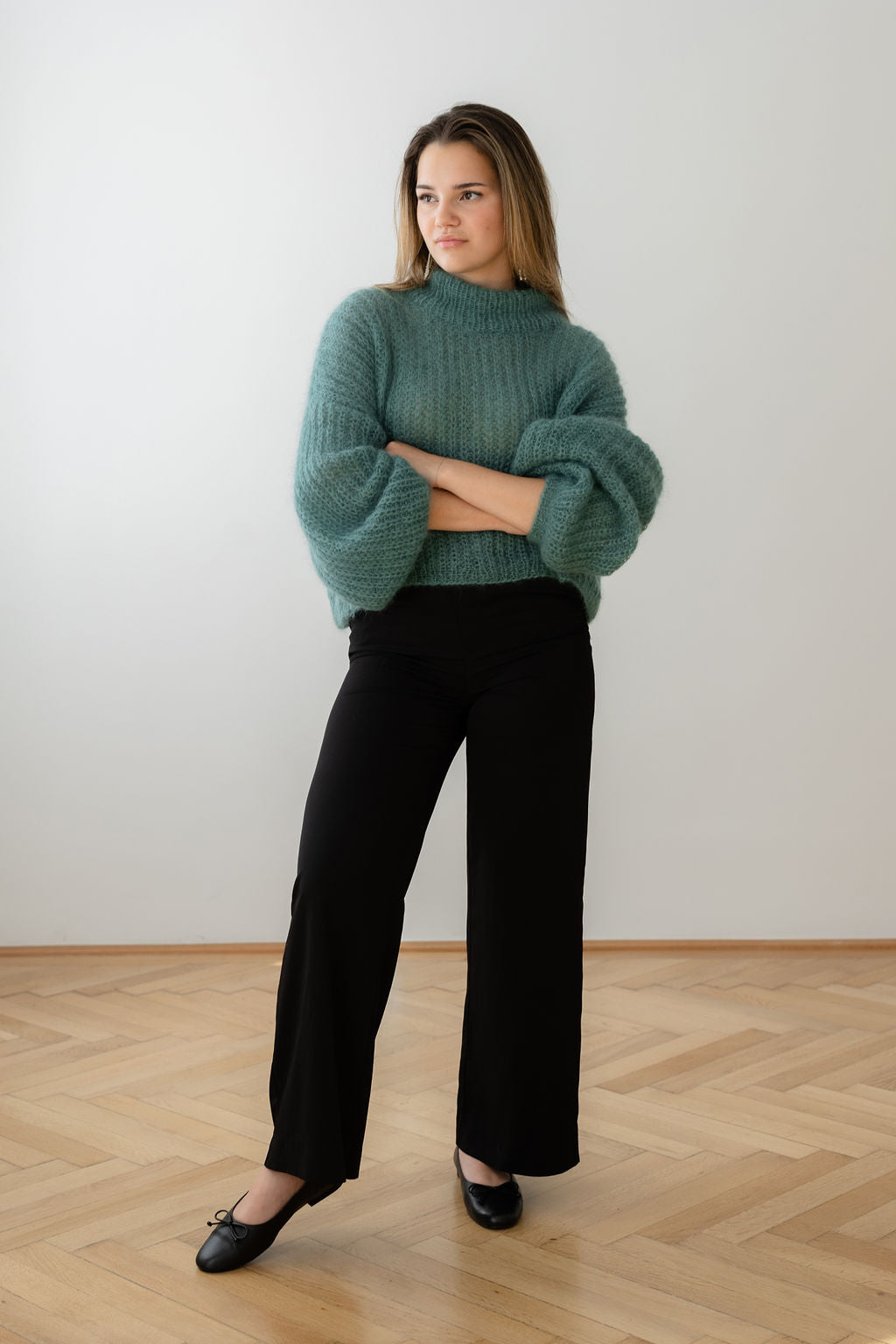 Hochwertiger und elegant-lässiger Oversize Pullover mit geripptem doppelten Stehkragen und typisch VUUNA Ballonärmeln. Der luxuriöse Mix aus edler und softer Mohair-Seide Wolle sorgt für einen kuscheligen Tragekomfort. Ganz besonderen Wert haben alle VUUNA Stücke: Sie sind liebevoll mit der Hand von Frauen in Serbien gestrickt. Den Sweater kannst du vielfaltig kombinieren: als casual Variante mit Jeans oder Hose oder elegant mit einem Rock oder Kleid.